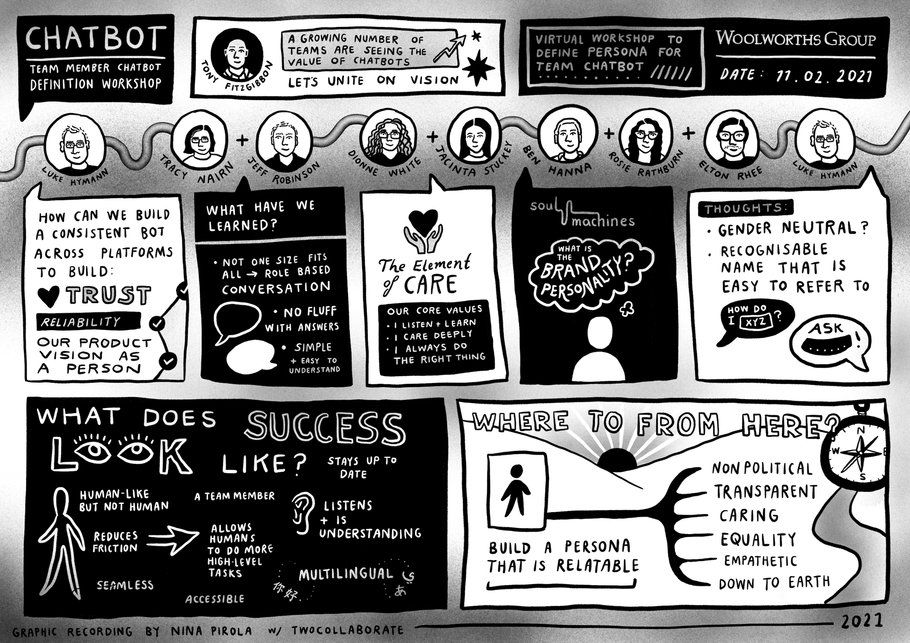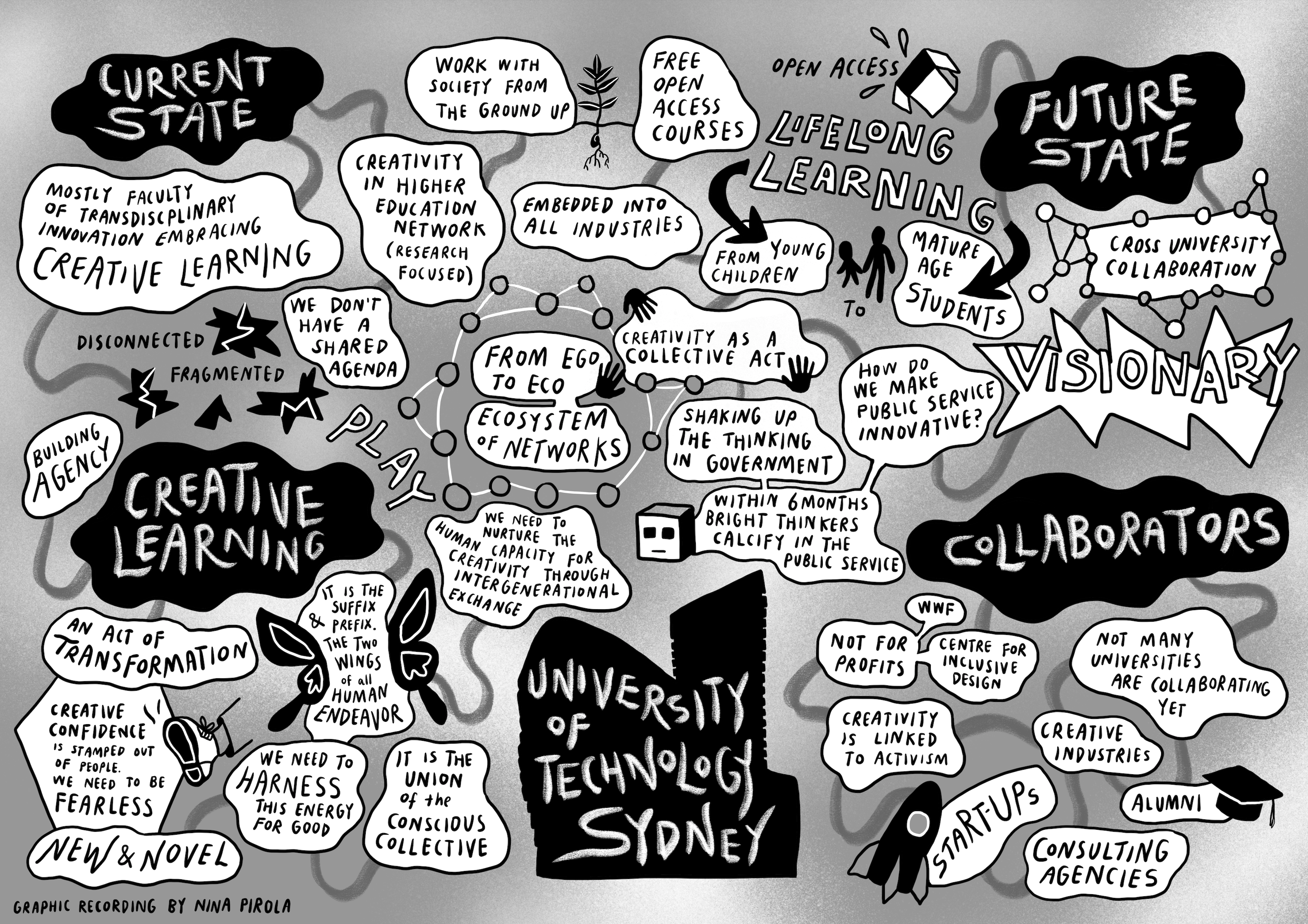 Graphic Facilitation, (a.k.a. graphic recording, graphic scribing or live visual note-taking) is a way of visualising conversation as it happens. I draw while listening to create a synthesised map of the rich information generated through discussion. The resulting image becomes a resource from which to reflect on, digest information and navigate complexity. It reimagines how we share knowledge, improving access for visual learners, facilitates creative thinking, memory retention and assists in gaining clarity and alignment.